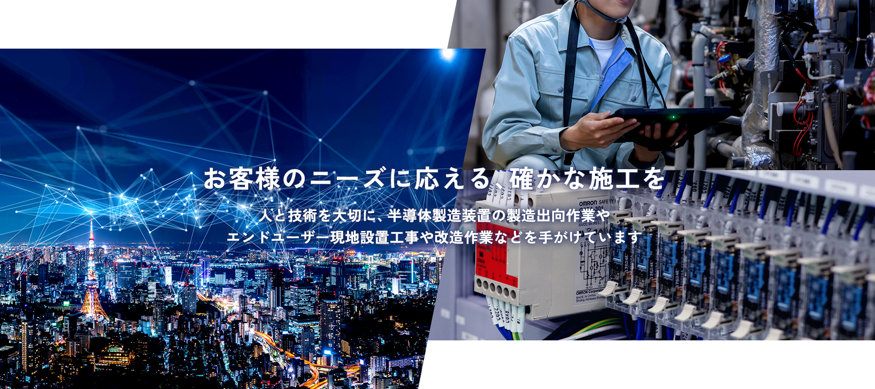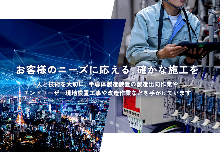 半導体装置の設置工事は、工場や施設内で装置を組立て、電気配線や調整を行いながら正常に稼働する状態へと仕上げていく作業です。